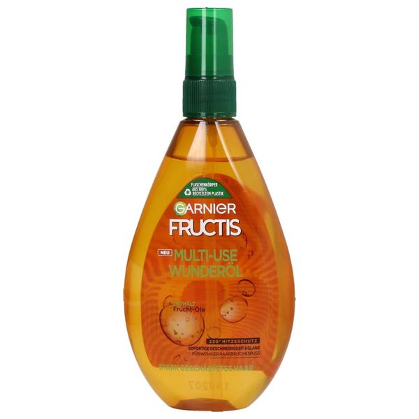 زيت للحماية من الحرارة والعناية ضد التجعد أمر لا بد منه للشعر الجاف والمتوتر. تحتوي العناية على زيوت الفاكهة الغنية التي تمنح الشعر التالف قوة جديدة للتألق. يمنحك الزيت شعرك نعومة حريرية ولمعانًا استثنائيًا دون أن يبدو دهنيًا بعد ذلك. تضمن التركيبة المكونة من المكونات النشطة من الفاكهة العشبية وبروتين الليمون والفيتامينات B3 و B6 شعرًا جيدًا وقويًا وسهل التمشيط في أي وقت من الأوقات! ولكن هذا ليس كل شيء: يعمل البخاخ أيضًا كحماية من الحرارة عند درجات حرارة تصل إلى 230 درجة مئوية ، ويجفف الشعر بسرعة مضاعفة كما يروض التجعد.