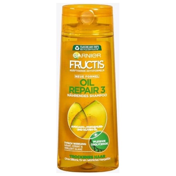 يحتوي شامبو إصلاح الزيت 3 من زيوت مغذية من الأفوكادو وجوز الهند والزيتون. بهذه الطريقة ، يتم إمداد شعرك بالرطوبة الكافية. تركيبة فعالة ولطيفة بشكل خاص مصنوعة من مكونات الفاكهة وفيتامين B3 / B6 وبروتين الليمون تمنح شعرك لمعانًا وقوة طبيعية.