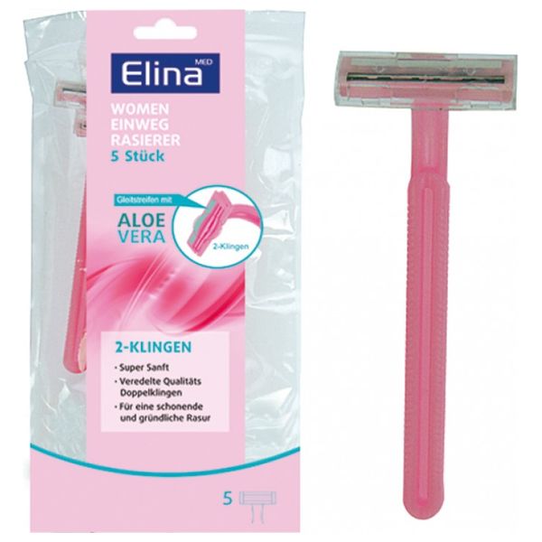 Elina-Med Shaving razor for women The razor contains 2 blades made of stainless steel (steel) and sharp to ensure a good and accurate shave. It also contains a cactus bar on the top to help the razor glide smoothly while shaving. Shaving and the body are wet (while showering) It is used to shave the body and sensitive areas. It is used for sensitive skin and all skin types, as it does not cause any sensitivity. To ensure an excellent shave, you can use Elina-Med women's shaving gel with wild aloe vera with the mousse. The bag contains 5 double-bladed pieces. Country of origin: Germany