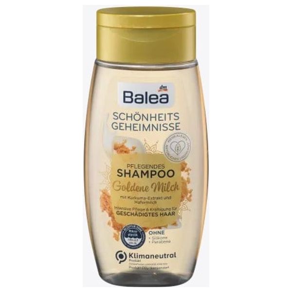 Shine and softness for damaged hair With turmeric extract and oat milk Without silicones and parabens More than 90% of ingredients of natural origin* Bottle body made from 100% recycled material** The Balea Beauty Secrets Shampoo Golden Milk has a rich formula with turmeric extract and oat milk. It ensures powerful hair with more shine and suppleness. More than 90% of the ingredients used are of natural origin - including water.* The skin compatibility is dermatologically proven. *Calculated according to ISO 16128-1. **Without clasp. Recipe without microplastics and water-soluble, purely synthetic polymers.