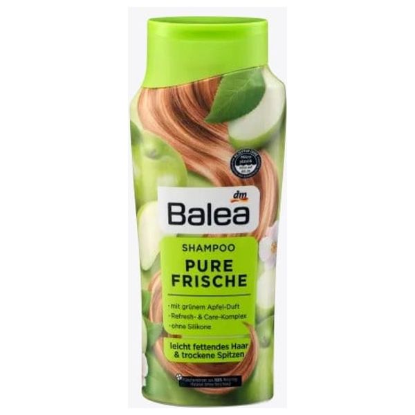 With a green apple scent Refresh & Care Complex For slightly greasy hair & dry ends Without silicones Skin compatibility dermatologically approved Pure freshness kick: The Balea Pure Fresh Shampoo with a green apple scent cleans your hair gently but thoroughly and gives it lively shine and radiance - right to the tips. Thanks to the building complex with vitamin B3 and provitamin B5, the mild formula cares for your hair wonderfully supple and revitalizes hair and scalp for a long time. Recipe without microplastics and purely water-soluble synthetic polymers.