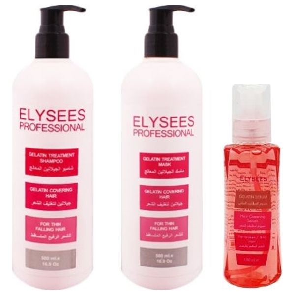 Haircare set with gelatin extract from Elysee for weak and damaged hair, exfoliates, reduces hair loss, gives strength and luster, and eliminates tangles and dryness of hair. The set contains: