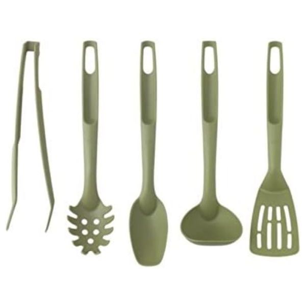 Includes: Spatula (13"), spoon (13"), soup ladle (11"), pasta server (12") and cooking tongs (11"). Gentle to pots and pans with nonstick coating Beautiful dark green color Includes 5 pieces - Value Set Dishwasher Safe