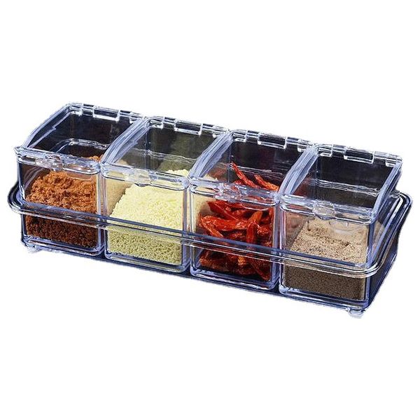 Clear Spice Container Set, Acrylic Spice Box of 4 Pieces, Spice Cabinets are designed with storage lid and spoon Material: PMMA Plasitc White color Size: 25 x 9.5 x 6.2 cm