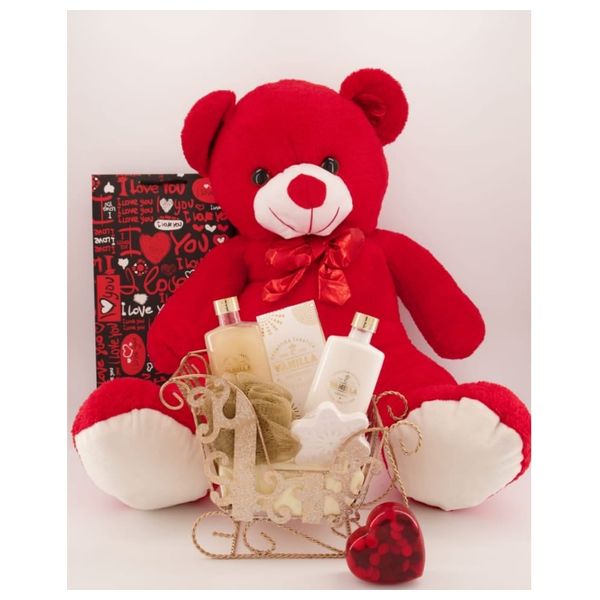5. Bathing loofah: made of a special fabric so that it does not cause allergies or scratch the skin of the body. 6. Golden cart: in the form of a sledge, inside of which all the above products are placed. Dimensions of the cart are 20 cm x 19 cm x 10 cm.